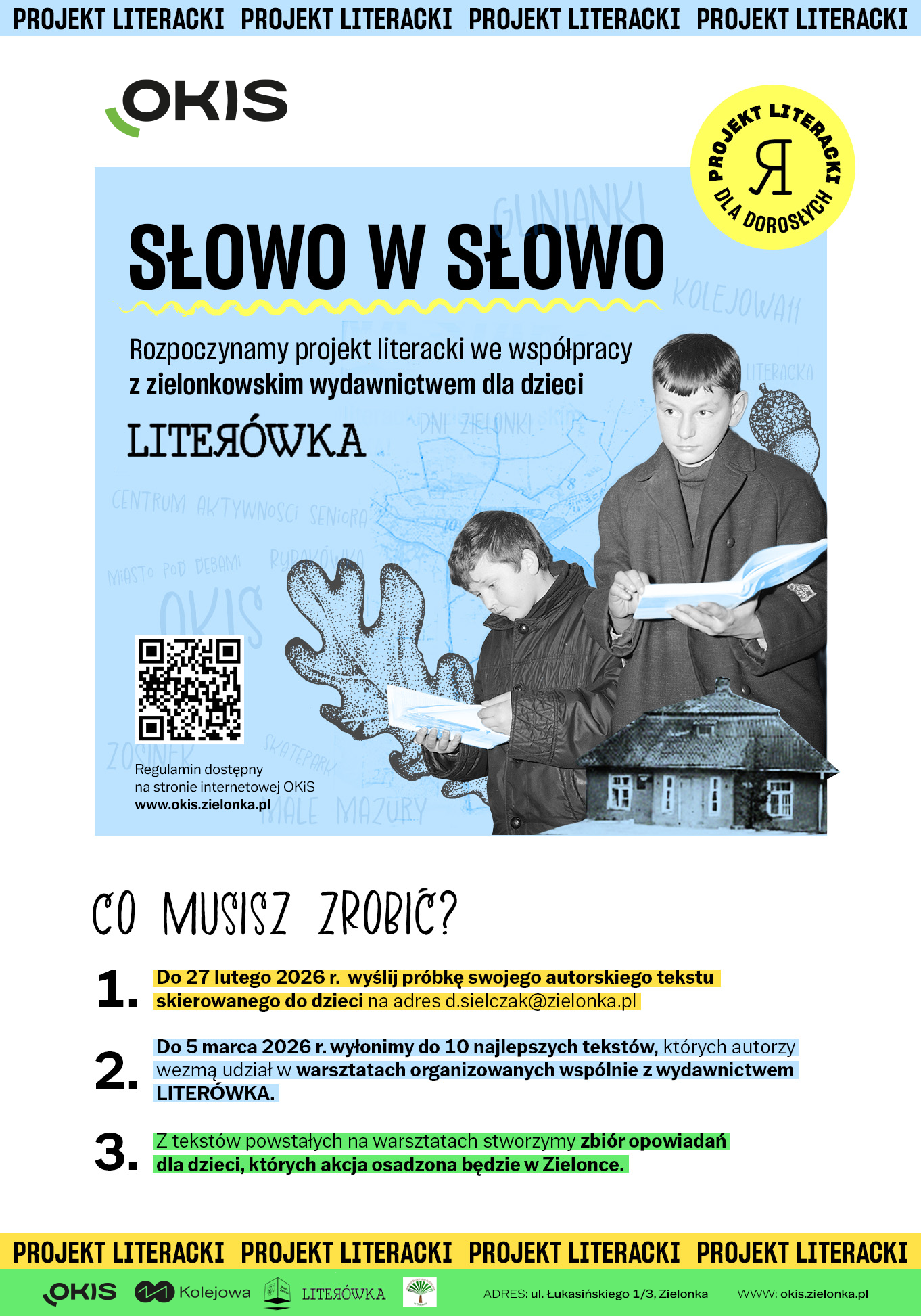 Zapraszamy do udziału w Projekcie Literackim „Słowo w słowo”, którego celem jest stworzenie i wydanie profesjonalnego zbioru opowiadań dla dzieci w wieku przedszkolnym, osadzonych w realiach Zielonki. Projekt organizowany jest przez Ośrodek Kultury i Sportu w Zielonce we współpracy z lokalnym Wydawnictwem Literówka oraz Miejską Biblioteką Publiczną w Zielonce. Wydane opowiadania będą bezpłatnie dystrybuowane wśród dzieci.